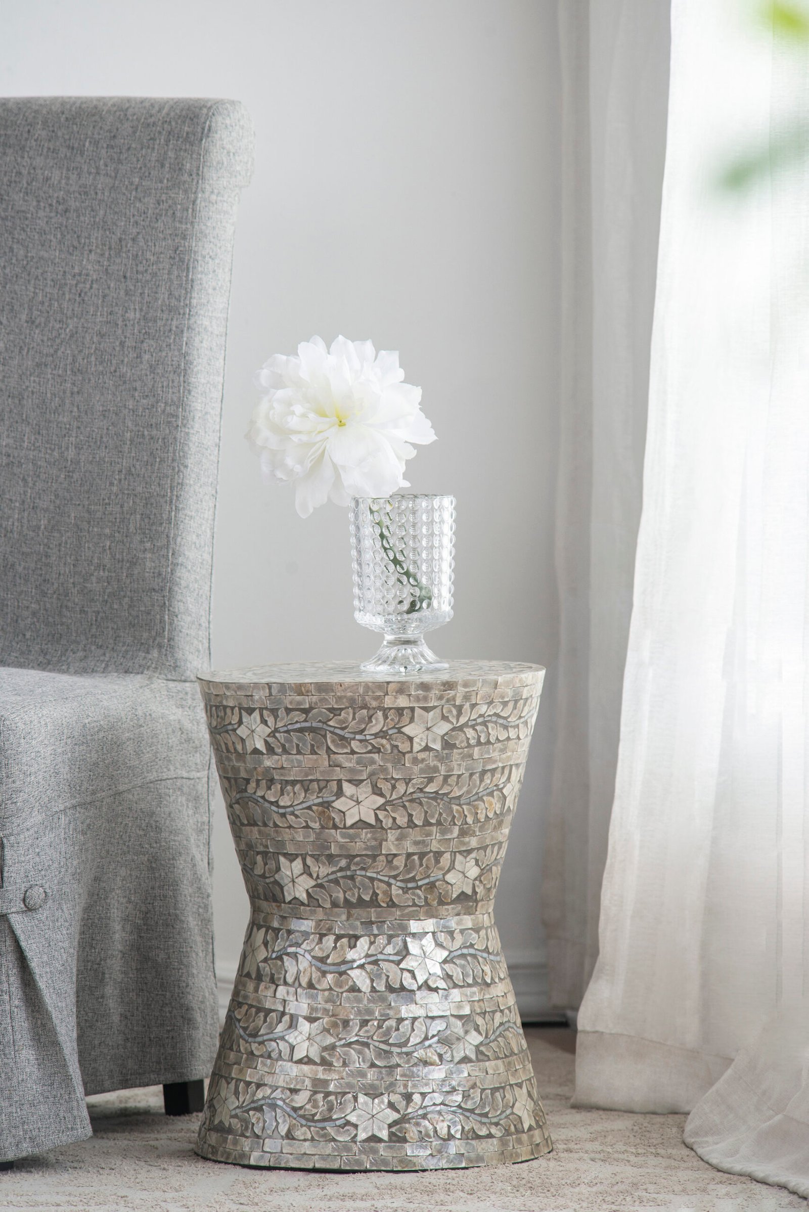 Introduce an element of refined elegance to your living space with the Mosaic Mother-of-Pearl Drum Side Table. Meticulously handcrafted, this hourglass-shaped accent table is adorned with hundreds of individually placed mother-of-pearl tiles, forming an enchanting pattern of vines and geometric blooms. The iridescent sheen of the inlay dances with light, offering an ever-changing display of natural luster.