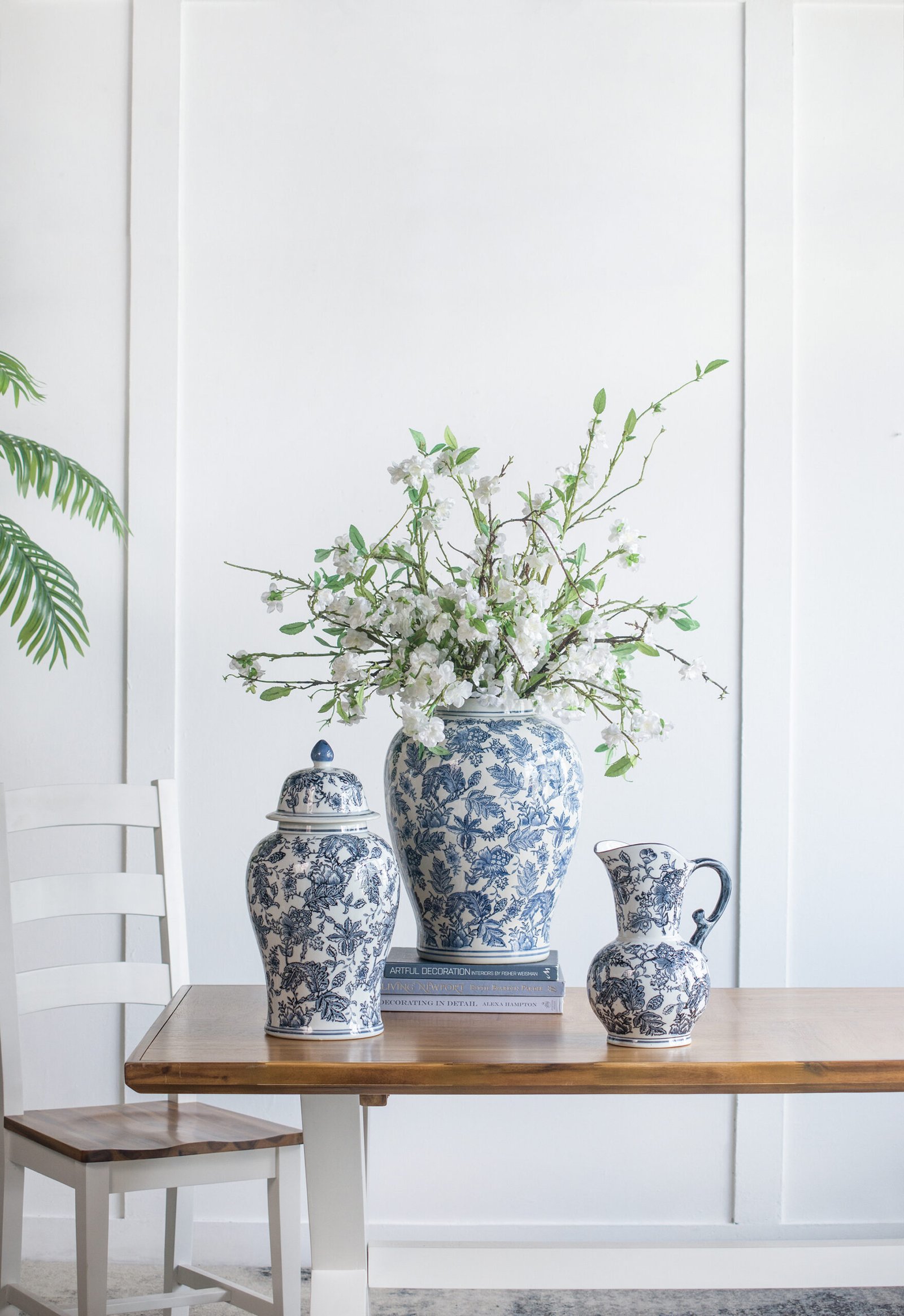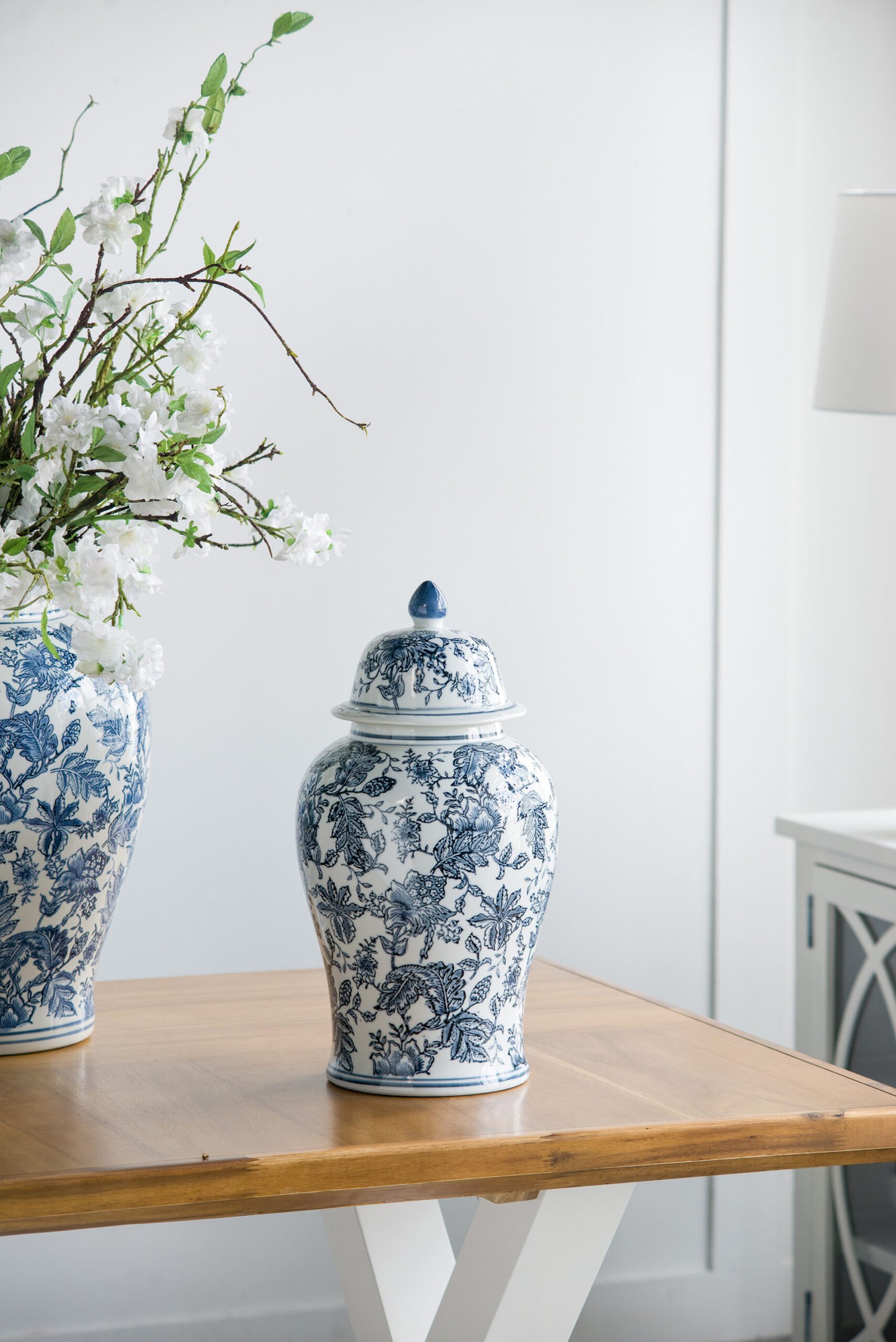 Infuse your home with the graceful artistry of the Blue & White Chinoiserie Lidded Ginger Jar, a decorative accent that echoes the sophistication of traditional Eastern porcelain. This beautifully crafted jar showcases a detailed botanical motif in a beautiful blue, delicately set against a warm white ceramic body.