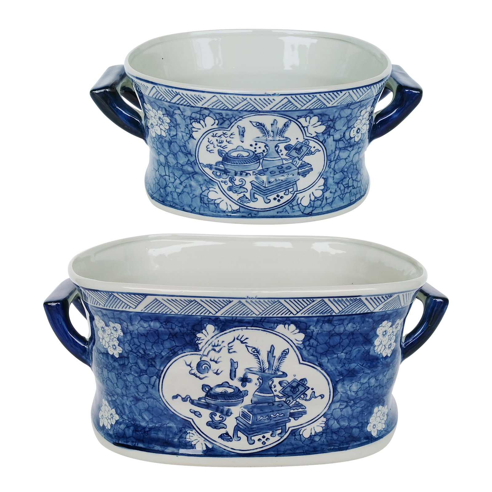 Each piece features an oval silhouette with flared sides and sturdy, integrated handles for easy handling. The stunning blue floral background is complemented by vignettes of traditional still-life scenes, adding a refined and serene aesthetic to any setting. Whether used together or separately, these planters make a beautiful statement in entryways, on dining tables, or as centerpieces.