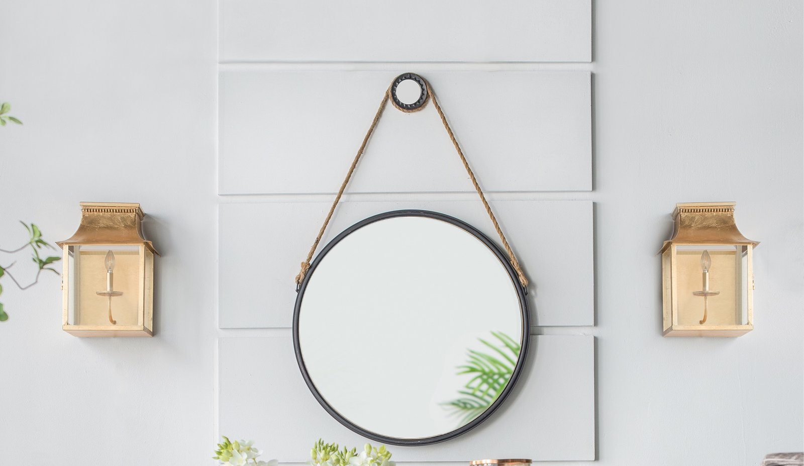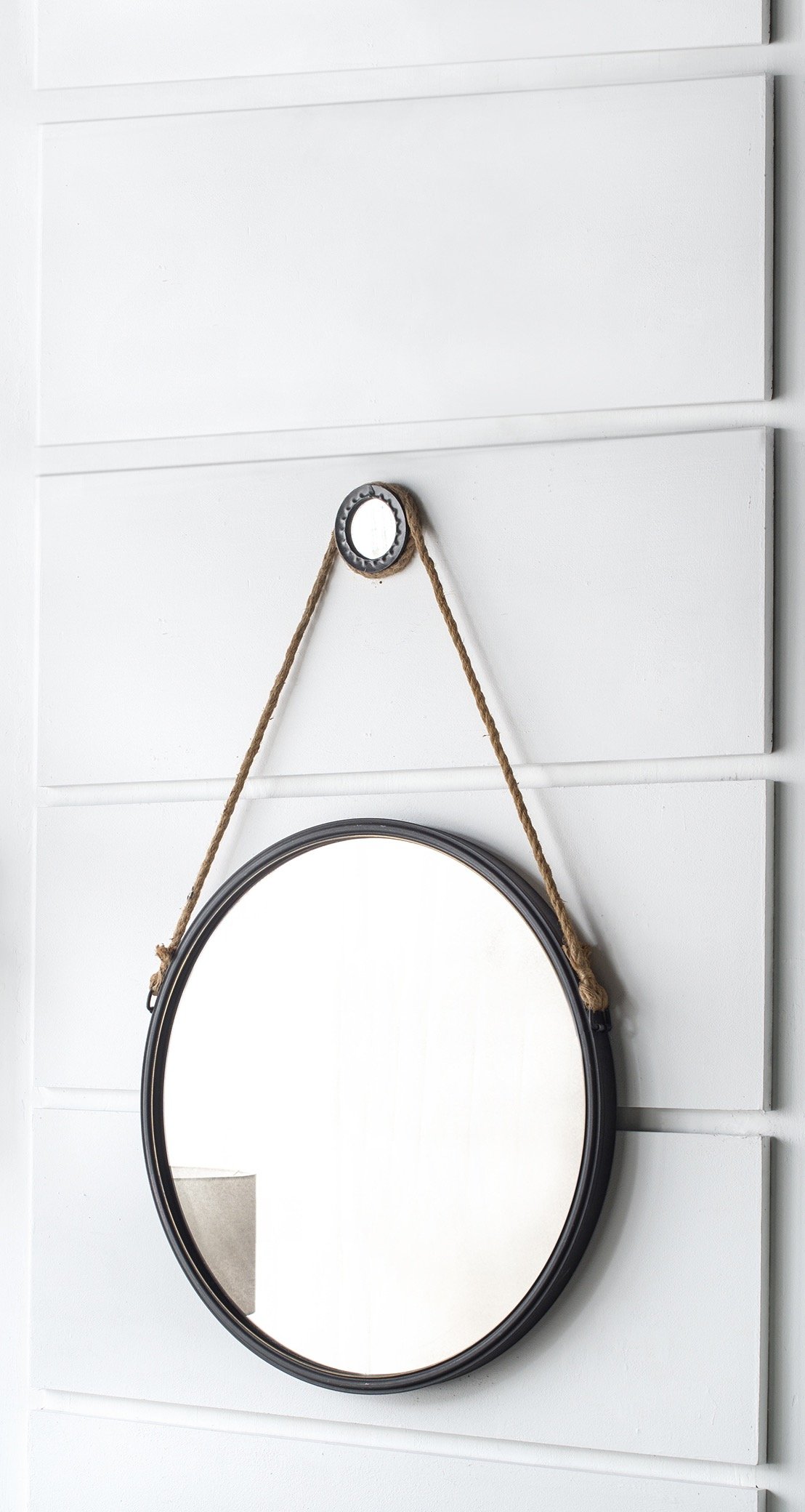 Bring a bold, modern edge to your home with the Industrial Round Mirror with Rope Hanging Accent. This distinctive wall mirror features a minimalist round silhouette framed in matte black metal, paired with a thick jute rope hanger for an unexpected mix of industrial strength and coastal character.
