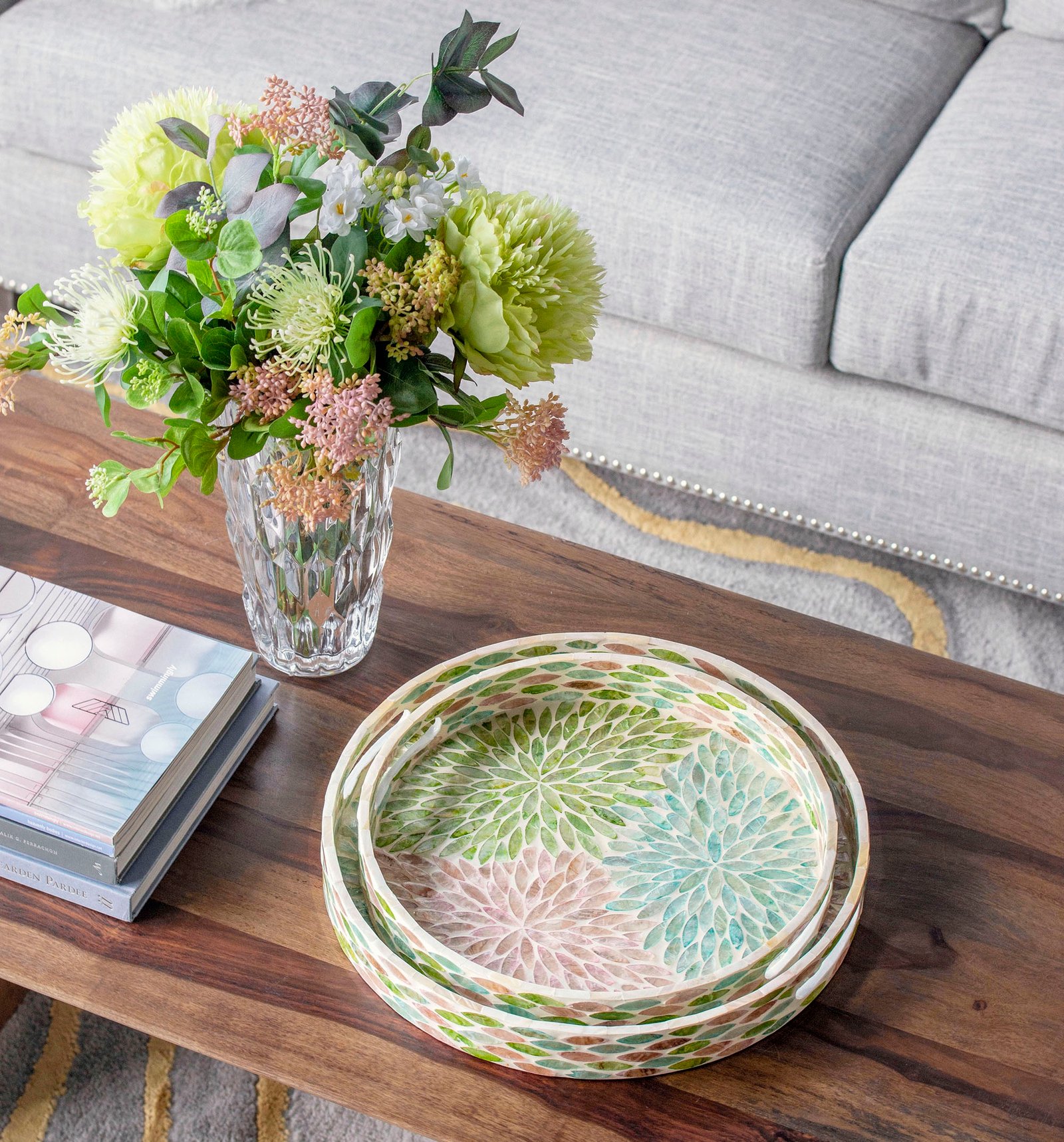 Infuse your home with vibrant charm and artisanal craftsmanship with our Iridescent Mosaic Floral Round Tray. This exquisite round tray is meticulously hand-inlaid with shimmering capiz shell tiles in a radiant floral pattern, featuring delicate shades of leaf green, petal pink, and crystal aqua.