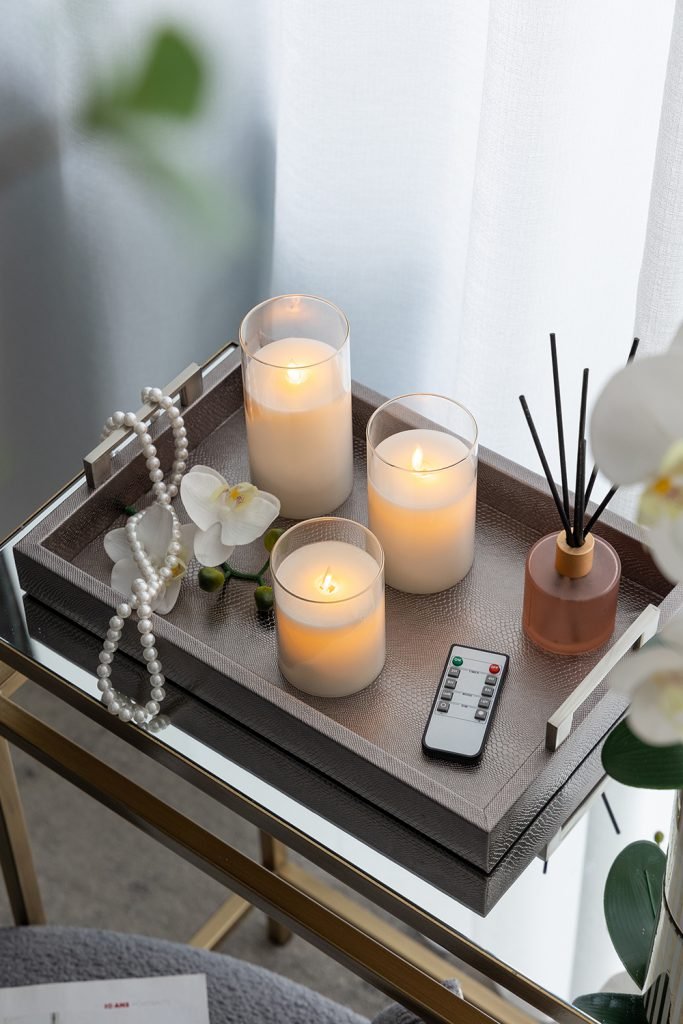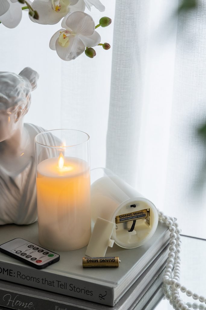 A set of three realistic flameless LED candles with remote control for effortless ambiance.